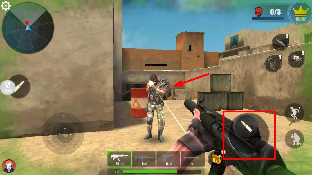 3、发现敌人后,瞄准目标并点击右侧的攻击按钮,角色就会用枪械射击敌人,同时要注意自己的弹药剩余量,以保证能够持续战斗。