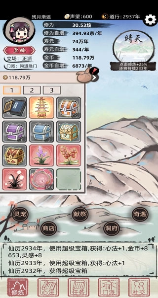 也可以通过接取任务,或者在商店、宗门处购买超级至高宝箱,开启后用能提供高额正道金钱加成的红橙品质功法,来替换掉低品质的功法。(不过要先按照攻略2的指引接取正道任务箱子哦)