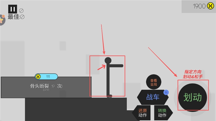 2、玩家需要想办法让火柴人遭遇粉碎性骨折,通过在空中完成各种动作,使火柴人在空中翻滚、碰撞,利用撞击产生的伤害来获取更高评分。游戏中还有更多挑战,都能自由解锁。