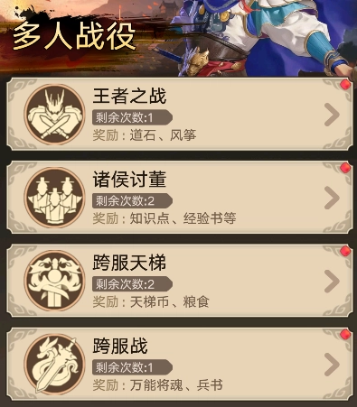 多人战役玩法涵盖【跨服天梯】【跨服战】【王者之战】【诸侯讨董】【乌巢押运】等内容,参与这些玩法能够获取相应的资源材料。
