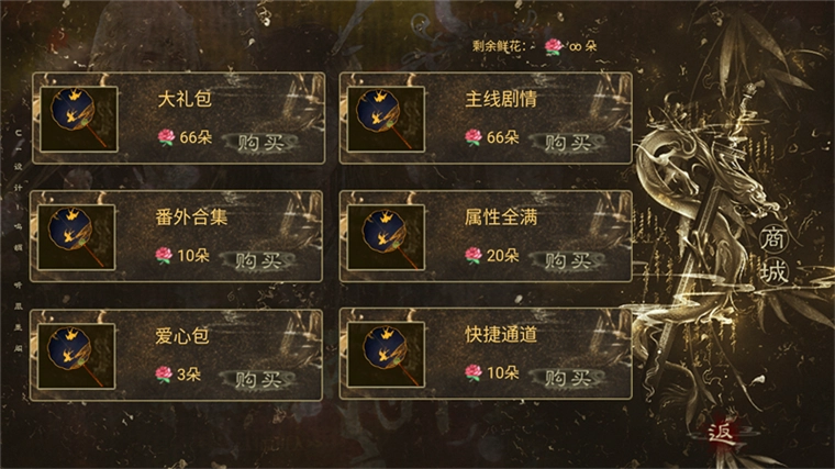 3、由于本作品已成功解锁无限鲜花,我们可以直接打开鲜花商城,购买大礼包、番外合集、主线剧情等商品。