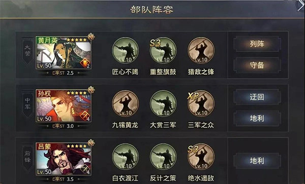 大营:黄月英(S3重整旗鼓+猎敌之锋),列阵/守备