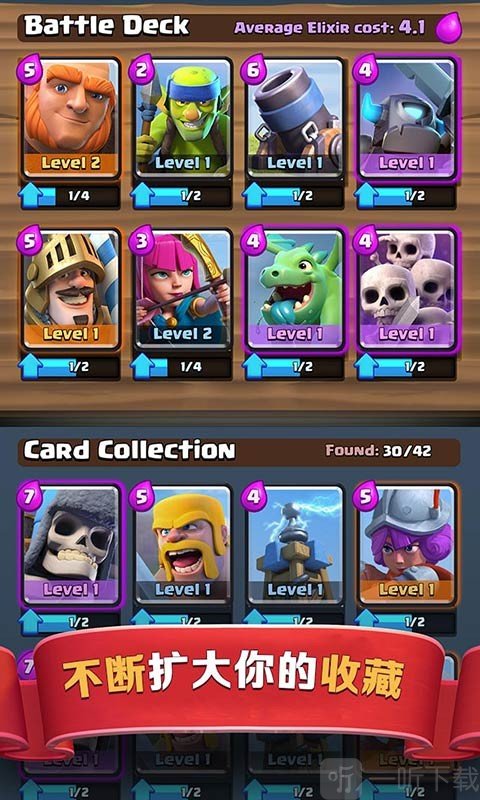 4. 收集皇室战争中的家庭成员,以及部落冲突里熟悉的军队、法术、防御性建筑等各类卡牌,用来构建并升级你的卡组。