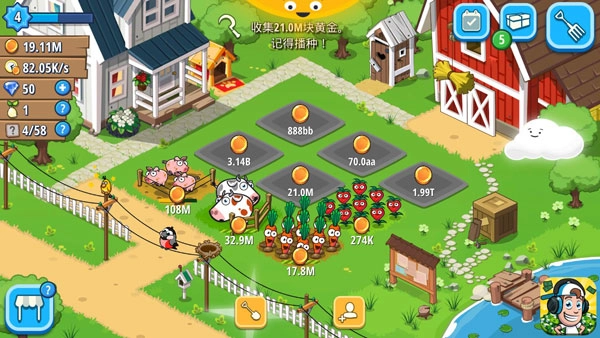 在《闲置农业帝国》里,玩家可以种植各类农作物,还能养殖多种家禽,鸡、鸭、鹅、猪等都是你要发展的对象。想要赚更多钱,就得不断扩大自己的种养规模。