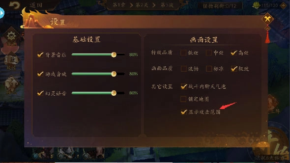 1、极限玩家的心头好,能显示幻灵的攻击范围。看着最后一只怪物乖乖待在主角面前,却又无计可施的模样;在关卡里点设置就能看到,主界面时点击主角头像再点设置也能打开哟。