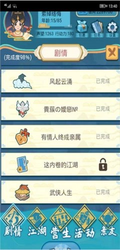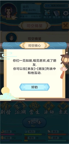 2、朋友。可在【江湖】板块结识,还能学习技能、缔结姻缘。