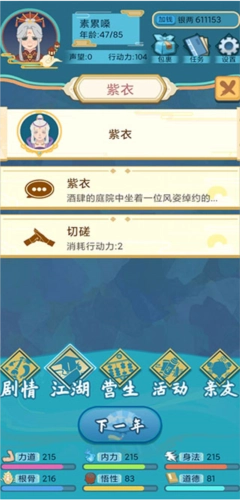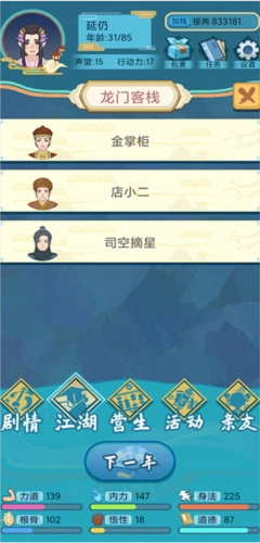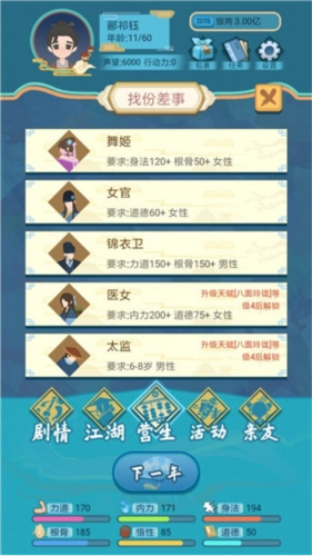 2、这款玩法并不复杂,从你进入游戏开始,每年都能自由决定要做什么:可以闯荡江湖、拜师学艺,也能找份差事谋生,比如开个镖局走镖;既能体验江湖上的各种奇遇,也能开山立派、扬名天下,当然,你也可以选择什么都不做,就在家里待着。在这个江湖世界里,你可以成为捕快、医女、锦衣卫,甚至还能选择当一名太监!
