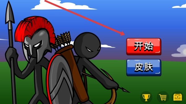 1、在火柴人主题的初始界面,点击红色的开始按钮,就能进入模式选择页面,开启冒险之旅。