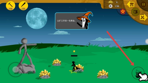 3、通过滑动方向键控制火柴人移动至矿物附近,点击右下角的对应图标,指挥矿工开采黄金,以推动内部资源的获取进度。