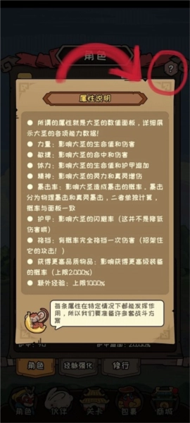 1、进入主界面的【角色】板块,点击该界面右上角的问号按钮,就能详细查看大圣的各项能力数据。