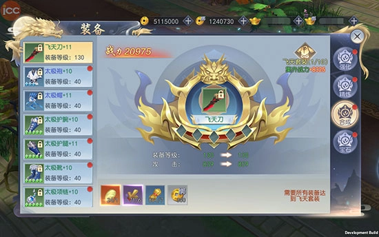 当前可合成的装备名称序列为:罗汉套装(初始装备)→太极套装→飞天套装→达摩套装→天王套装→光魔套装