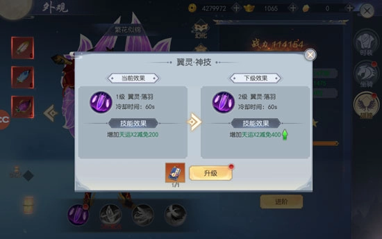 翅膀达到2阶时,将解锁翼灵·落羽技能,该技能能够增加天运X的减免效果。