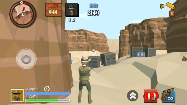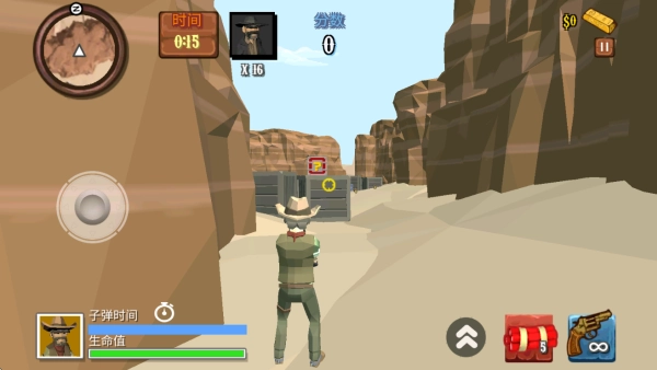 2、拿起对应的枪械,瞄准隐藏的强盗,手动装填子弹并完成射击,消灭敌人后收集奖励和隐藏的战利品。