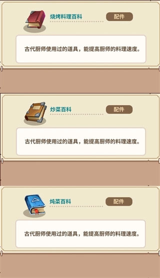 首先来分析一下这三种分别用于减少炒、炖、烤类烹饪技法时间的配件。这三种配件仅能缩短对应技法菜谱的烹饪时长,这便是它们存在局限性的原因。我个人并不推荐使用这些配件,不过也不能直接将它们归为鸡肋。我们可以安排三个厨师佩戴炖类配件、三个厨师佩戴烤类配件、两个厨师佩戴炒类配件,让厨师们去制作对应的菜谱,这样也能发挥出这些配件的作用。