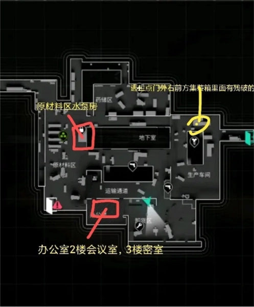 小伙伴们在游戏前期,建议多囤积一些铁材料,它能卖出不错的高价。等开启寄售功能后,每件铁能卖到八千,所以前期多攒点肯定没错。另外,地图上也能找到铁的刷新点,像巴夫工厂就有一个,具体位置见下图: