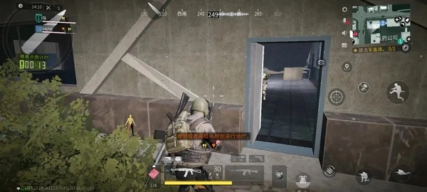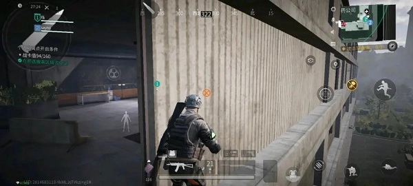 医药公司大楼的每一层都设有这种墙沿,要是敌人追来,你可以躲到窗户外侧的墙沿上伺机偷袭对方。不过得留意身后高处是否有狙击人机,以及地面有没有人机;楼内离你较近的人机也会锁定你,一旦被盯上就会暴露位置,所以可以先把这些人机清理掉。