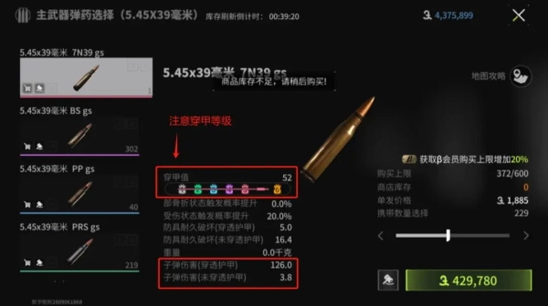 子弹分为1到6级不同等级,每个等级的子弹能穿透对应等级的护甲,就像图里展示的那样,5级子弹可以穿透5级护甲,造成126点穿透伤害,要是没穿透的话,只能造成3.8点伤害。进入游戏对局后,四级子弹差不多是必备的,因为大部分玩家都穿着3级以上的护具,要是带低级子弹进地图,那伤害就跟刮痧一样,所以子弹的消耗需求特别大。