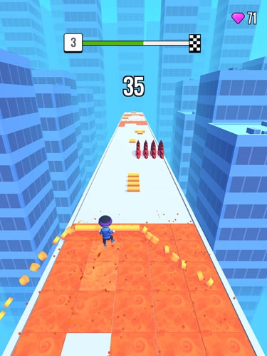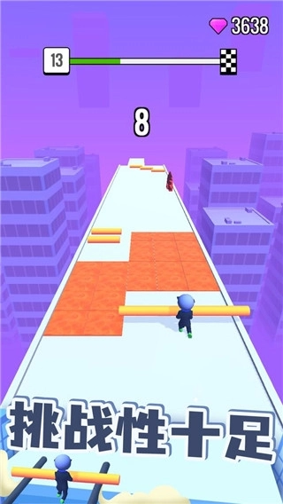 2、该玩法采用左右滑动屏幕的设定,玩家将在游戏中扮演一位手持棍棍在屋顶前行的角色,穿越重重关卡,收集各类道具,完成每个趣味关卡的挑战。