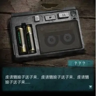 旁边的柜子上放着一个笔筒,从中可以拿到铅笔。柜子下方的柜门需要输入密码才能打开。用铅笔将散开的磁带卷好,然后把磁带装入随身听中。进入1号门后,使用铜护甲打开洋娃娃的电池扣,取出电池。把电池放进随身听,按下播放键,就能得到提示,具体内容见下图。
