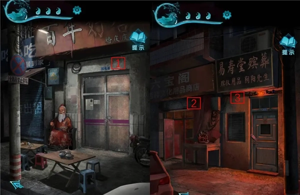 1、想出门却出不去,茶几的抽屉也打不开,这时电风扇吹落了挂历,从中找到了钥匙。用这把钥匙打开茶几抽屉,拿到玉簪后就能出门了。可在路上遇到了鬼打墙,通过剧情了解到需要点烟才能破除。为了方便描述,给图中的店铺编上号:1号是婚庆用品店,2号是文化用品店,3号是殡葬用品店。