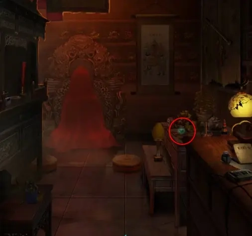 打开下方的柜门,里面放着一个洋娃娃,不过它的电池被锁住了,得找工具来拧开。供桌的香炉里藏着东西,拿寿碗去舀,能得到一碗香灰,还能从香炉里取到香炉铲。右侧的柜子上了锁,需要钥匙才能打开。用香炉铲可以将门打开,这样就能出去了。