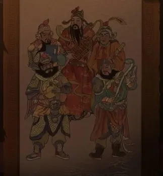 把所有灯都打开后,查看左侧的佛龛,能拿到一张符咒,空盘子暂时不清楚该放什么东西。后面用红布盖着的佛像无法查看,右侧墙上挂着一把剑。将吊坠挂上去,再把中间的挂件移到右边,让剑指向辰时,就能得到小金鞭,此时后面的画像会打开,里面是五路财神的画像。3号店大门的玻璃上有一串数字534680862,计算它们的和等于42。接着去1号店门口,找到月老手中的盒子,输入042,打开后就能得到玉如意。