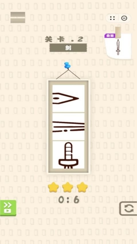 3、第二关之中出现了“剑”这个题目,只需根据具体的顺序调整图案布局即可,完成之后可获得三星成绩。