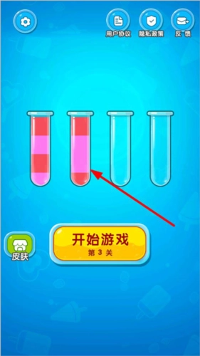 4、对杯子里的颜色进行排序,直到所有杯子中的颜色都一致,接着把水倒入各个水管,以此完成挑战。