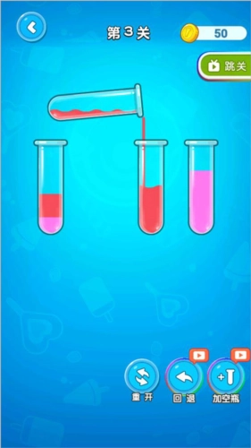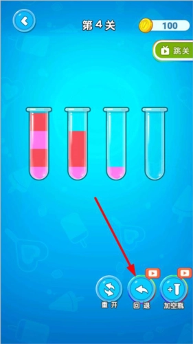 3、要是不小心把玻璃瓶里的水倒错了,别慌,点击下方的回退按钮就能返回,也可以点重开按钮重新开始。