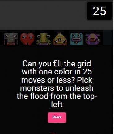 观察颜色之间变化,看相邻的两种或多种色块中,那种颜色面积更大;就选择相应颜色的怪兽,点击突出洪水填充颜色,交替填充;游戏很紧张,有限制的,必须在25步之内填充所有颜色才能赢得比赛。从游戏的画风来看,我觉得这个画风实在是让人有点忍俊不禁的想笑。作为一款小游戏,用来打发时间绰绰有余。