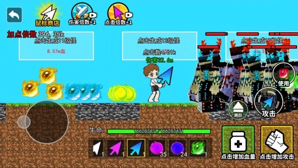 2.战斗结束后,系统会依据造成的总伤害量给予金币和素材奖励,这些奖励可用于在升级界面提升攻击、暴击、攻速等基础属性。