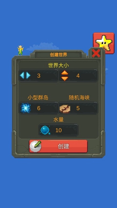 2、点击白色图标可进入创建世界的选项,在这里你可以自定义地图尺寸、岛屿类型以及水域面积等参数。