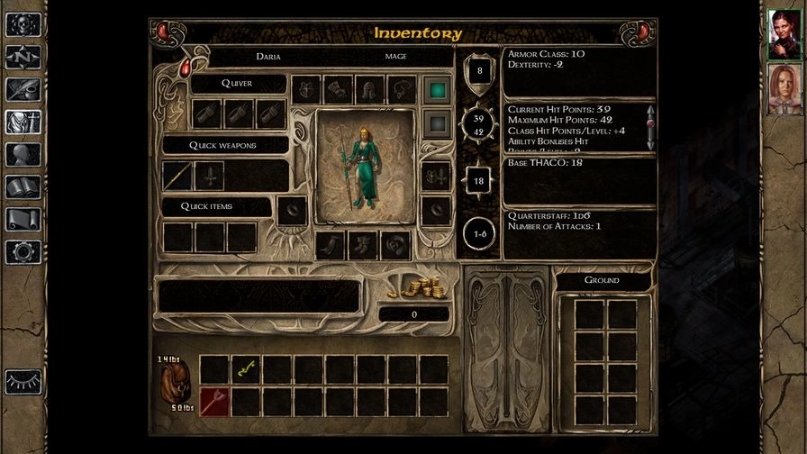 游戏开始时,主角被囚禁于地牢之中,遭受到名为JonIrenicus的强大法师折磨。他称你为“神之子”,暗示你体内蕴含着未被发掘的力量。不久之后,Imoen出现并协助逃脱,在途中解救了两位可招募同伴Minsc与Jaheira。经历一系列战斗后成功逃离地牢,进入城市并与神秘人物发生冲突,最终踏上寻找失踪亲人的旅途。
