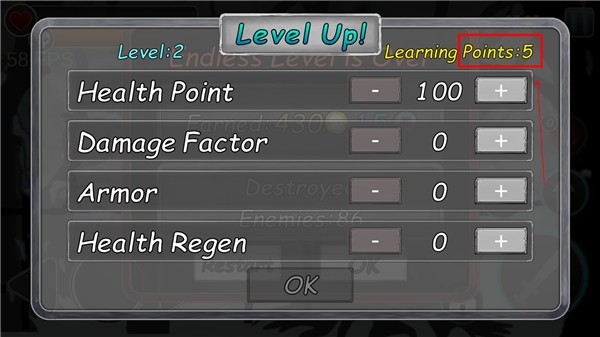 5、等级提升后还能获取技能点,这些技能点对应的属性从上到下依次是血量、攻击力、防御和恢复,你可以按照自己的喜好来分配加点。