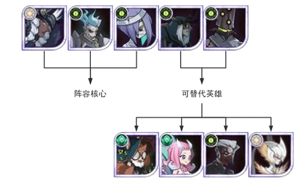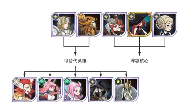 中期我们采用商魅呆阵容,成员包括商人、狮子、呆萌、魅魔(紫品质魅魔就能上场,最好能升到红色品质并把专属提升到30级)以及蝴蝶。其中狮子和蝴蝶的位置,可以根据实际情况换成兔弓、骨弓、凤凰、奈拉、三眼、皮帕等英雄。