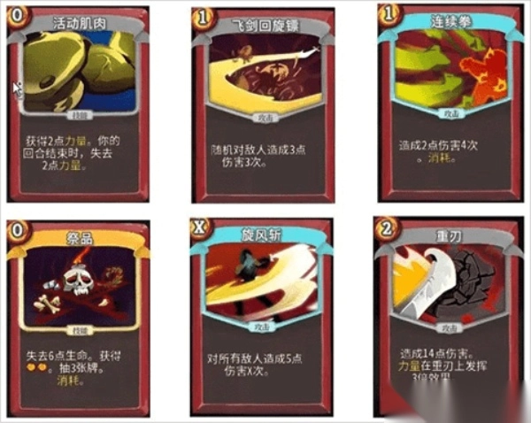 重刃:在力量战里堪称最强的单体攻击牌,具备5倍力量加成效果,能够轻易打出100以上的伤害。突破极限:与活动肌肉协同配合,能在一个回合内将力量大幅叠升,强化后不会被消耗,进而实现输出最大化。遇到这两张牌,有机会一定要拿。