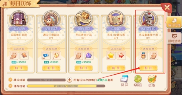 角色达到90级后会解锁「皇家骑士团」玩法,该玩法的入口可在玩法界面的每日历练板块中找到。