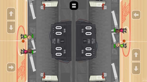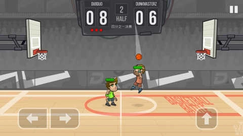 游戏里控制角色移动的方式是按住屏幕左下角的两个箭头,而控制角色跳投则需要用手指按住屏幕右侧的空白区域。不过跳投时有个小细节要注意:得在主角跳到空中时就松开手指,不然角色是不会把篮球投出去的。