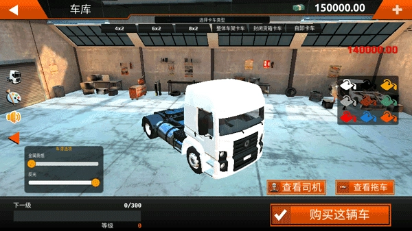 进入“车库”界面,浏览各种各样的卡车,根据车辆的性能参数或者自己的个人喜好,挑选并购买属于你的第一辆爱车。
