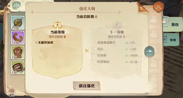首先需要打开角色的背包,此时角色的装备栏也会随之显示出来。接着大家可以选择想要强化的装备,之后就能看到相关信息以及操作选项,点击“强化”按钮即可进入下一步操作。