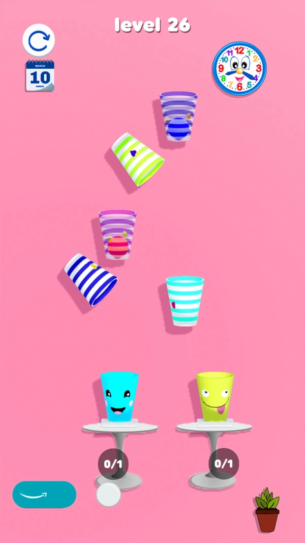 1、绚丽多彩的游戏画面,思索让光滑小球落入另一个杯子的最优策略