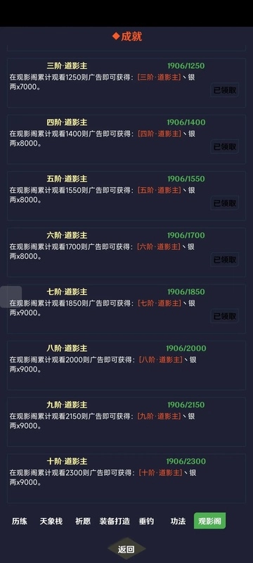 成就系统不仅能带来属性加成与银两奖励,到了后期,其提供的属性增益效果会变得十分显著!值得注意的是,历练、观影、天象这三项内容,只能依靠时间的逐步积累来完成。
