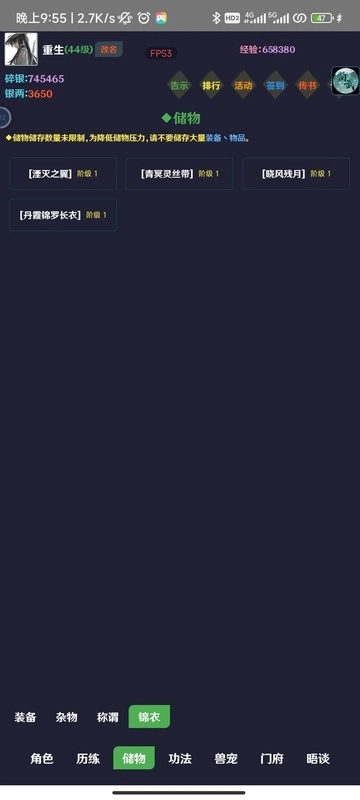杂物里不卖的物品会上锁,锦衣和称谓激活后有经验加成,建议优先获取。