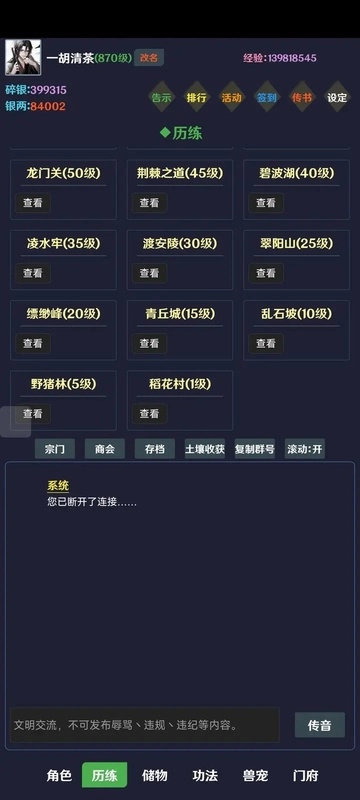 1--【历练】新增:炎阳荒漠(2200级)、紫云山岭(2250级)、皓月草原(2300级)、幻梦石窟(2350级)。