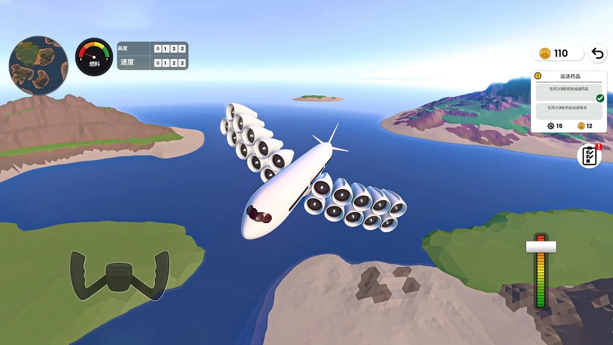 挑选飞行任务,通过操控油门和方向盘来调节速度与方向,在开放式的世界地图里自由穿梭,去应对各种地貌以及天气所带来的影响。