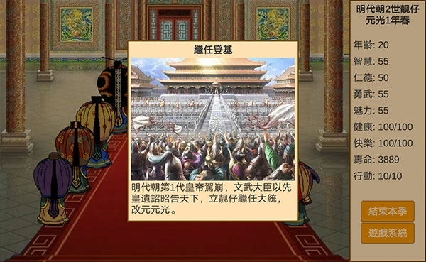 玩家需要处理颁布法令、平定叛乱、灾害救援等各类朝政事务。