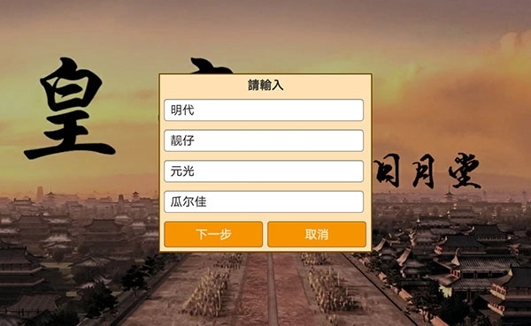 2、选择好之后,依次输入朝代、名称、年号,太子名称,点击“下一步”