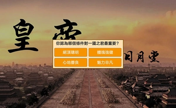 游戏的背景设定在古代中华文明时期,玩家能够穿越到各个不同的朝代,去亲身体验不同皇帝的人生历程。2、游戏里包含了众多真实的历史事件与人物,玩家只有掌握相关的历史知识,才可以更顺利地推动自己国家的发展。