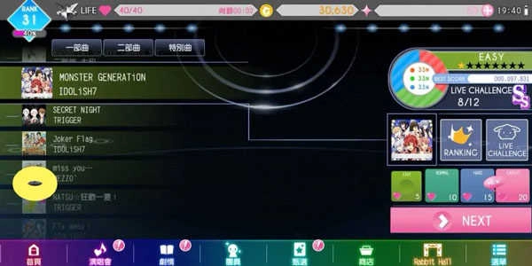 在主界面上,我们不仅能自主挑选歌曲,还能够选择歌曲的难度级别。爱娜娜的歌曲大致包含四个难度,其中第一个是【EASY】