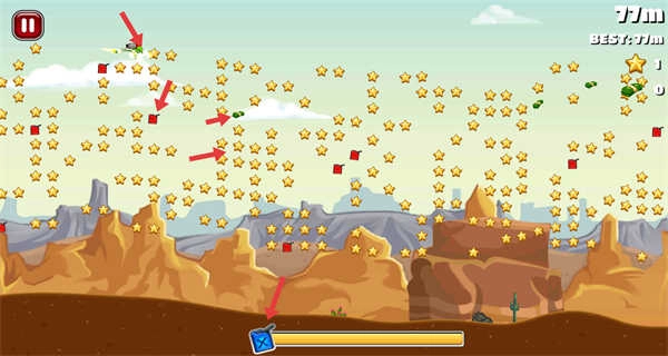 持续操控摩托车,尽量收集更多星星、钞票与油桶;飞行距离越长,分数也会随之提升,同时要留意进度条,保证有充足的续航能力。